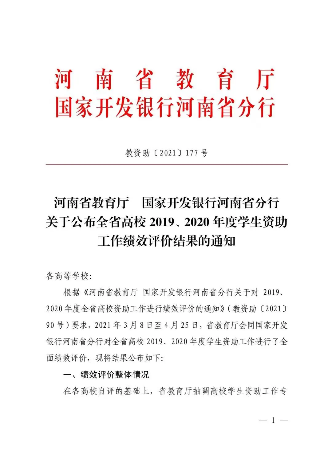 近日,河南省教育厅公布了全省高校2019、2020年度资助工作绩效考核结果,在对全省151所高校考核中,我校取得“良好”等次。